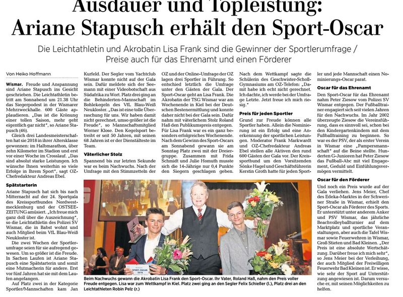 In der Kategorie Sportler/Mannschaft gewann Ariane Stapusch (Leichtathletik, PSV Wismar) den Sport-Oscar vor Jan Kurfeld (Segeln, Yachtclub Wismar) und der Behinderten-Bohlekegelmannschaft des VfL Blau-Weiß Neukloster.